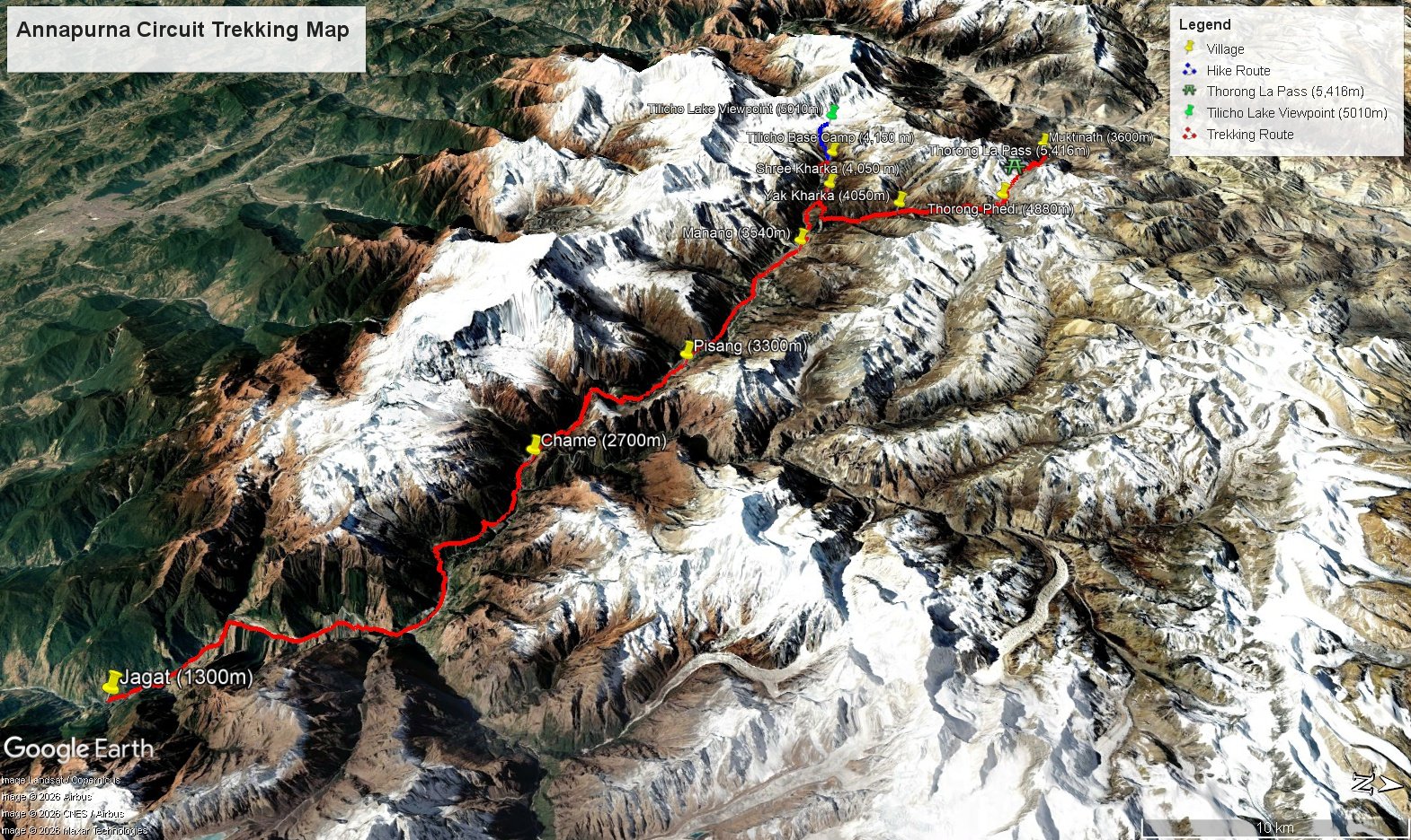 The Annapurna Circuit Trek is one of the world’s most famous and diverse long-distance treks. It circles the entire Annapurna massif, crossing the dramatic Thorong La Pass (5,416 m) one of the highest trekking passes in the world and offering ever-changing landscapes: subtropical valleys, terraced rice fields, traditional Gurung and Manangi villages, deep gorges, high alpine deserts, Buddhist monasteries, and panoramic views of Annapurna I (8,091 m), Dhaulagiri (8,167 m), Manaslu, Tilicho Peak, and more.