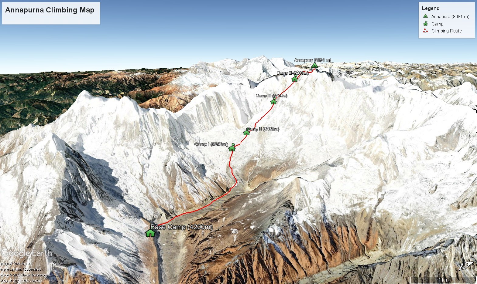 Today’s demanding climb takes you from Camp 1 toward Camp 2, ascending steeper snow and ice slopes in increasingly thin air. The route approaches the edge of the “Sickle,” a distinctive and exposed feature on Annapurna I that marks a key transition in the upper mountain terrain. Reaching this point provides a significant acclimatization gain and valuable familiarity with the route. After spending time at this altitude, you carefully descend back to Camp 1, allowing your body to recover while reinforcing high-altitude adaptation.