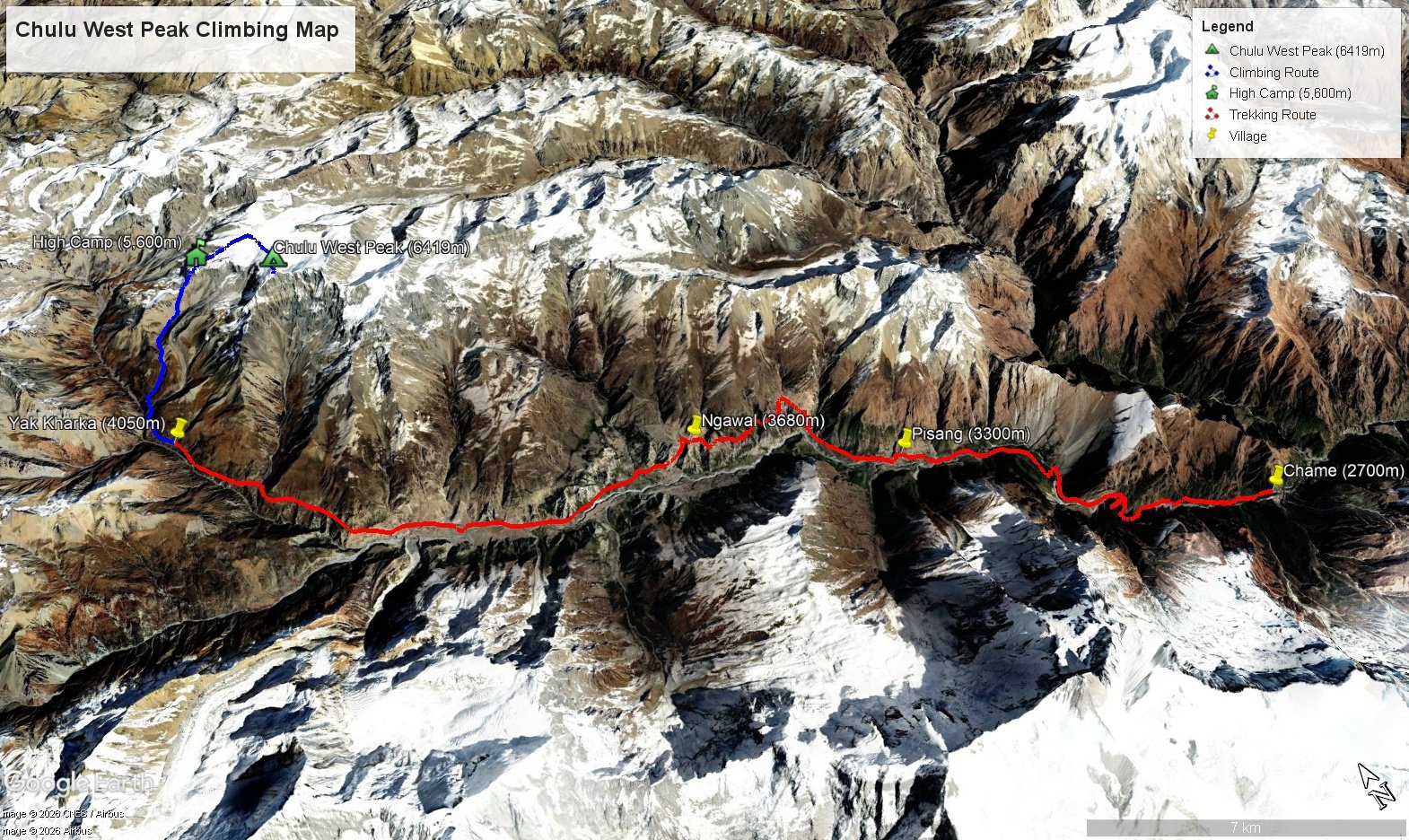 The standard route begins with a drive from Kathmandu to Chame, followed by the Annapurna Circuit trek through Pisang and Ngawal. From Ngawal, the route branches toward Yak Kharka and climbs to high camp at approximately 5,600m. The summit push from high camp involves ascending steep snow and glaciated terrain to the summit ridge at 6,419m. The descent follows the same route back to high camp, then down through Ngawal and Humde before the drive back to Besisahar and Kathmandu. The route requires confident crampon technique and fixed rope skills throughout the upper mountain section and should not be attempted without a certified guide.