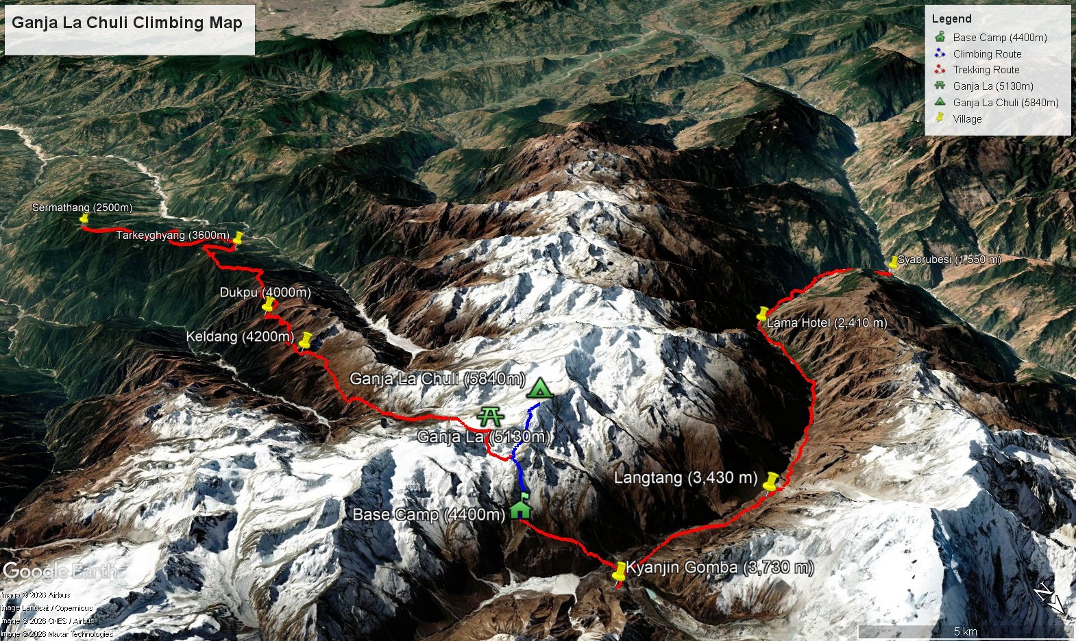 The standard route begins with a drive from Kathmandu to Syabrubesi, followed by the Langtang Valley trek through Lama Hotel, Langtang Village, and Kyanjin Gompa. From Kyanjin Gompa, the route ascends to base camp at 4,400m before the summit push to Ganja La Chuli at 5,840m. After descending from the summit, the route crosses the Ganja La Pass at 5,130m and descends into the remote Helambu region through Keldang, Dukpu, Tarke Gyang, and Sermathang before the drive back to Kathmandu. This linear point-to-point route is one of the most complete and varied mountain journeys available at this altitude level in Nepal, combining Tamang culture, high Himalayan terrain, a genuine summit, a dramatic pass crossing, and the peaceful Sherpa villages of Helambu.