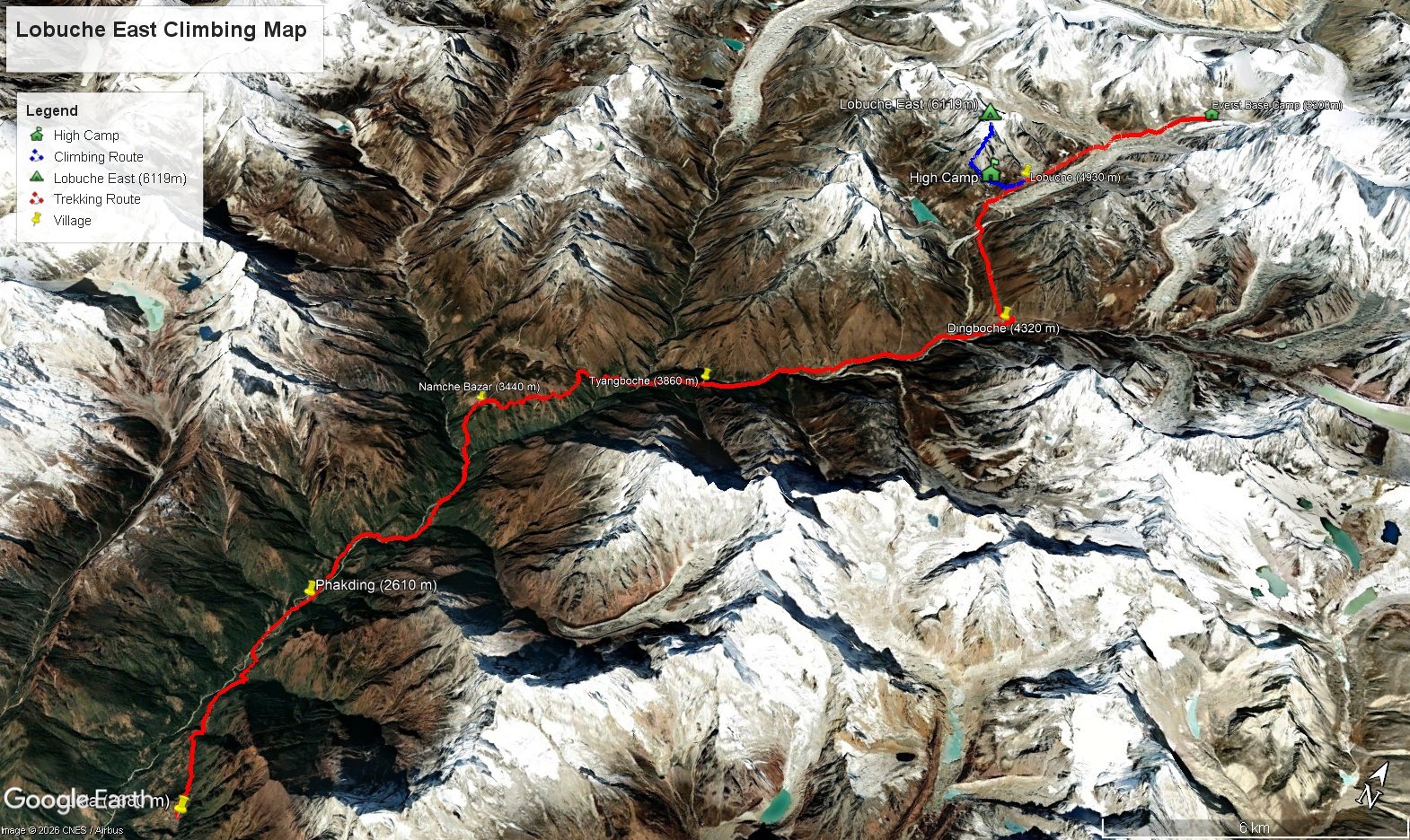 The standard route begins with a flight from Kathmandu to Lukla, followed by the classic Khumbu trek through Phakding, Namche Bazaar, Tengboche, Dingboche, and Lobuche to base camp at 5,000m. A detour to Gorakshep and Kala Patthar is included before the climbing phase begins. From base camp, the route ascends to high camp at 5,400m before the summit push. The final section involves ascending steep rocky and snow terrain, traversing glaciated slopes, and climbing fixed ropes to reach the summit ridge at 6,119m. The descent follows the same route back through base camp and the Khumbu Valley to Lukla. The route requires confident crampon technique and fixed rope skills and should not be attempted without a certified, experienced guide.